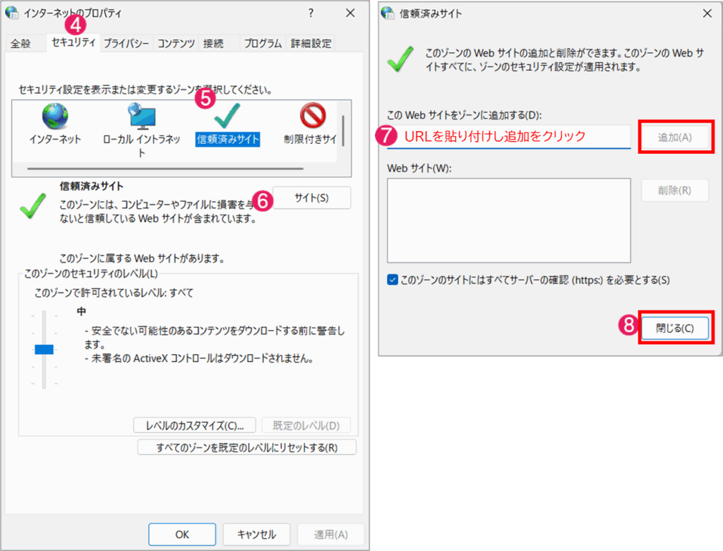 ブラウザへの登録(edge or chrome)にて解消しない場合はインターネットオプションへの登録も併せてお試しください。