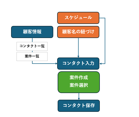 A. 顧客情報画面から「コンタクト入力」→ 案件名を選択(または新規作成)→ 保存でOKです。