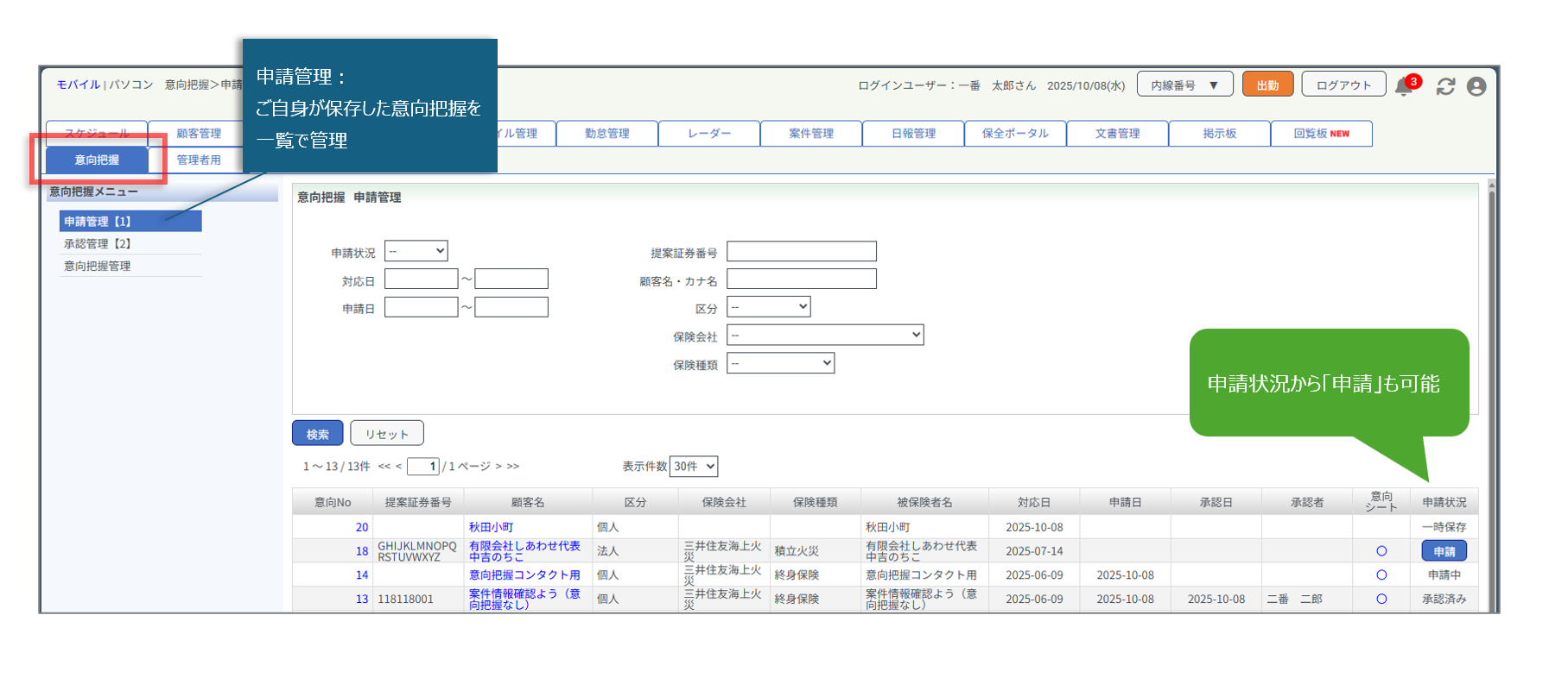 ▼ 申請管理:ご自身が保存した意向把握を一覧で管理