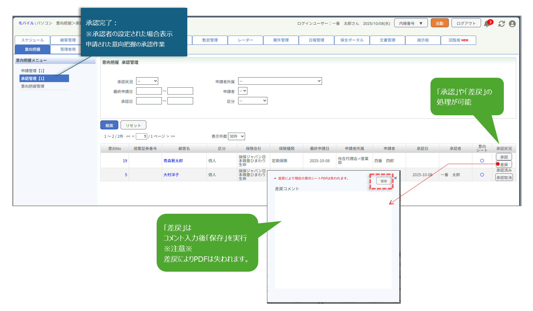 ▼ 承認管理(※承認者として設定したユーザーに表示):申請された意向把握を一覧で管理