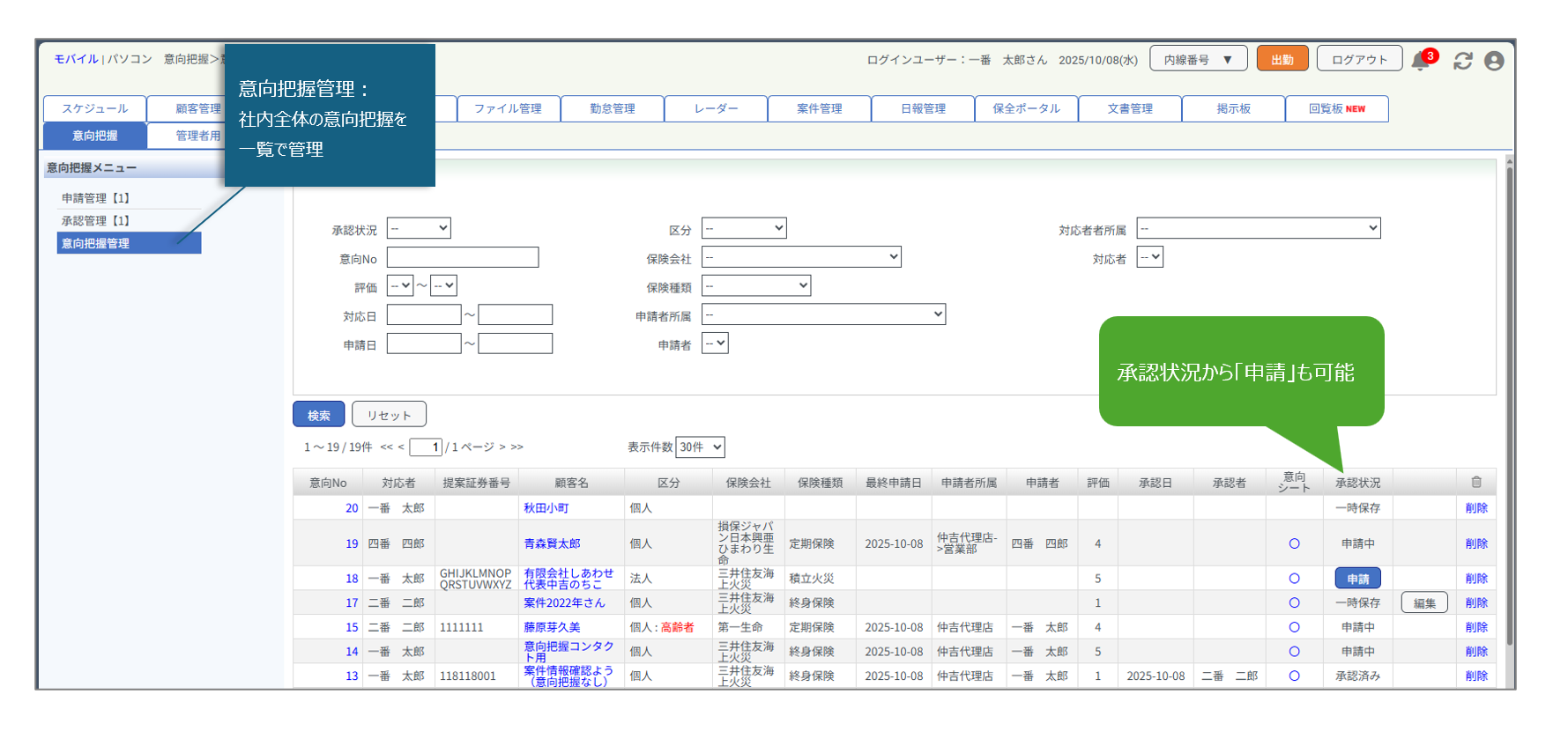 意向把握画面では、自身で保存した内容に加え、社内全体の意向把握も一元的に管理・確認することが可能です。