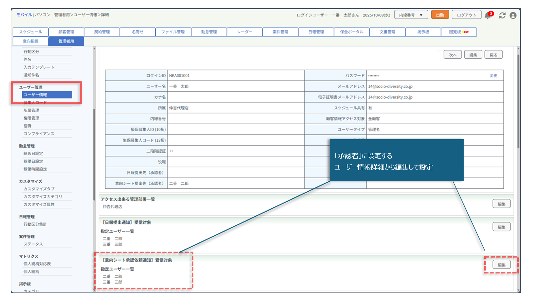 ・対象ユーザー詳細画面の「意向シート承認依頼通知 受信対象」を編集し、承認対象のユーザーを選択