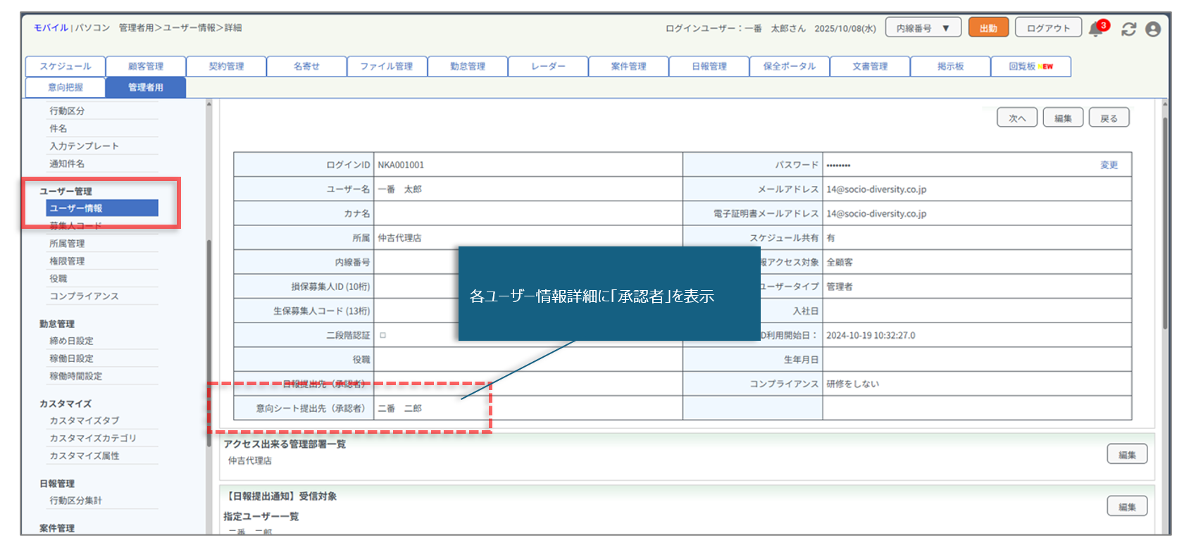 システム管理者権限の「管理者用」メニューのユーザー情報にて、意向把握の承認者設定を行います。