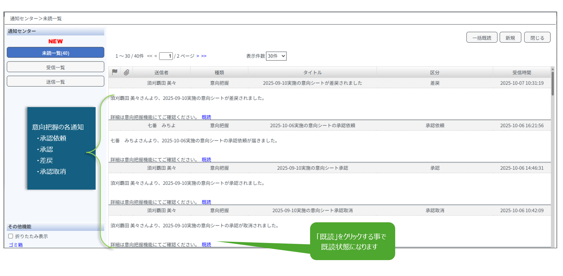 ※ 受信対象として選択したユーザーが「申請」する意向把握を、承認管理にて承認や差戻の対応が可能になります。