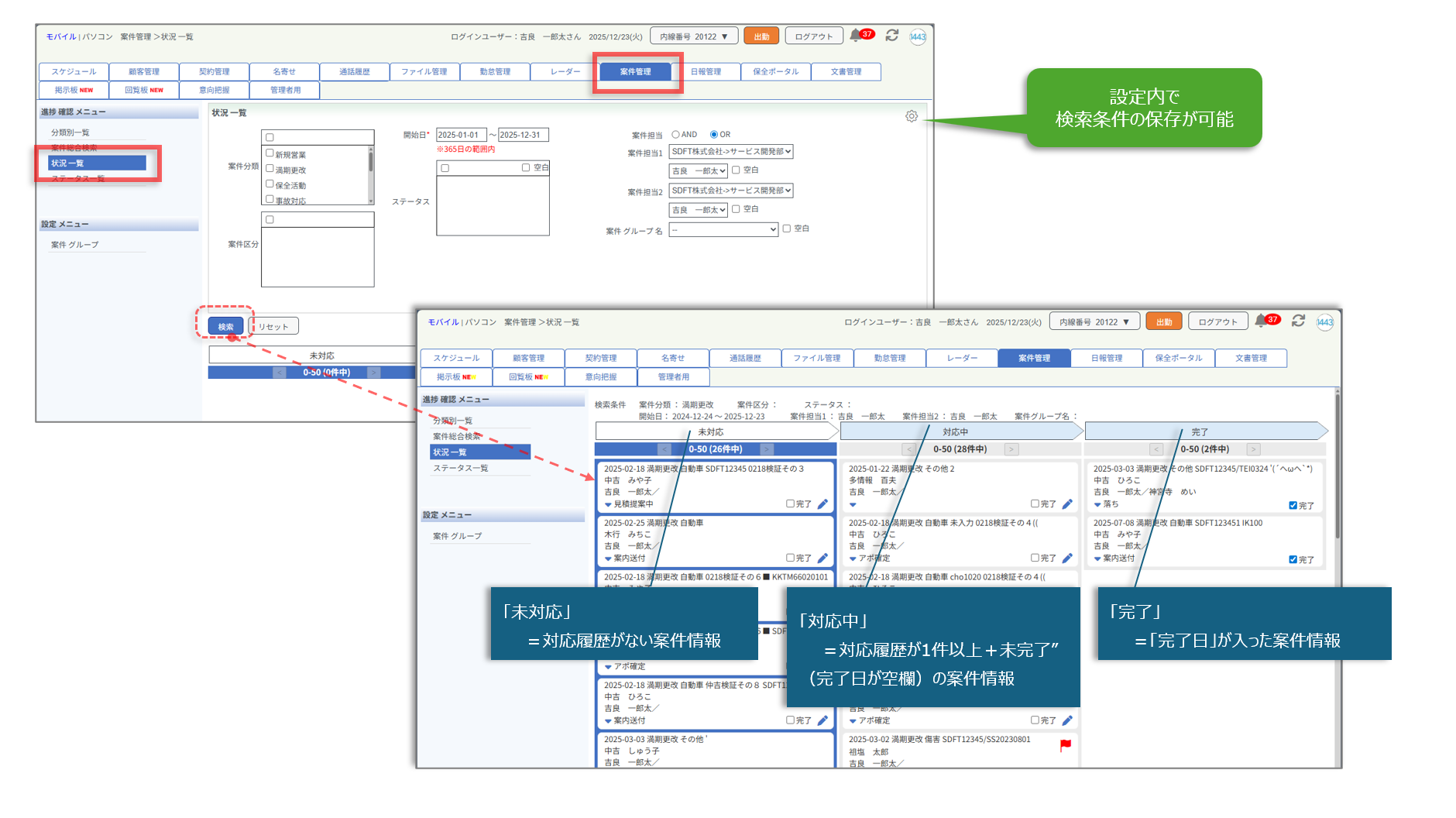 案件情報において「未対応」「対応中」「完了」の3種類の状況を判断し、一覧表示する機能を追加しました。