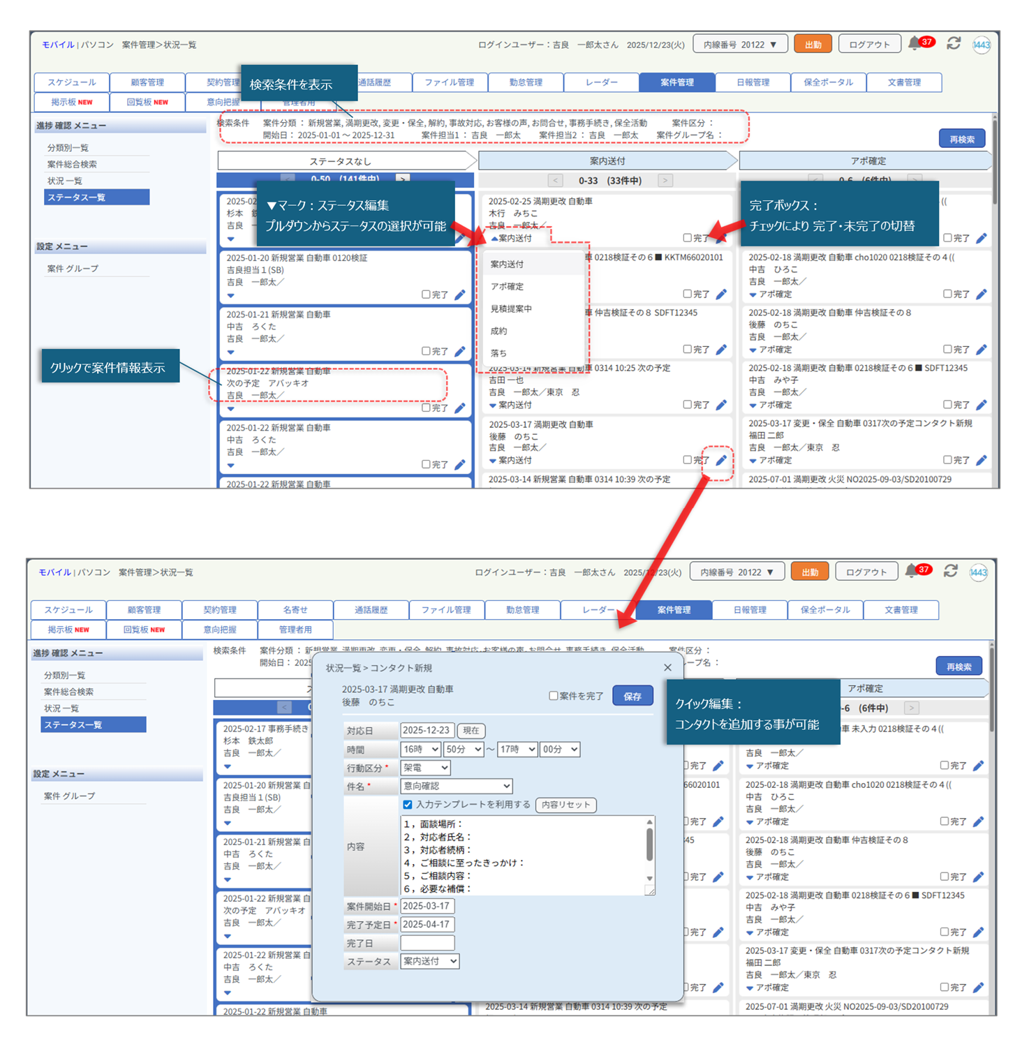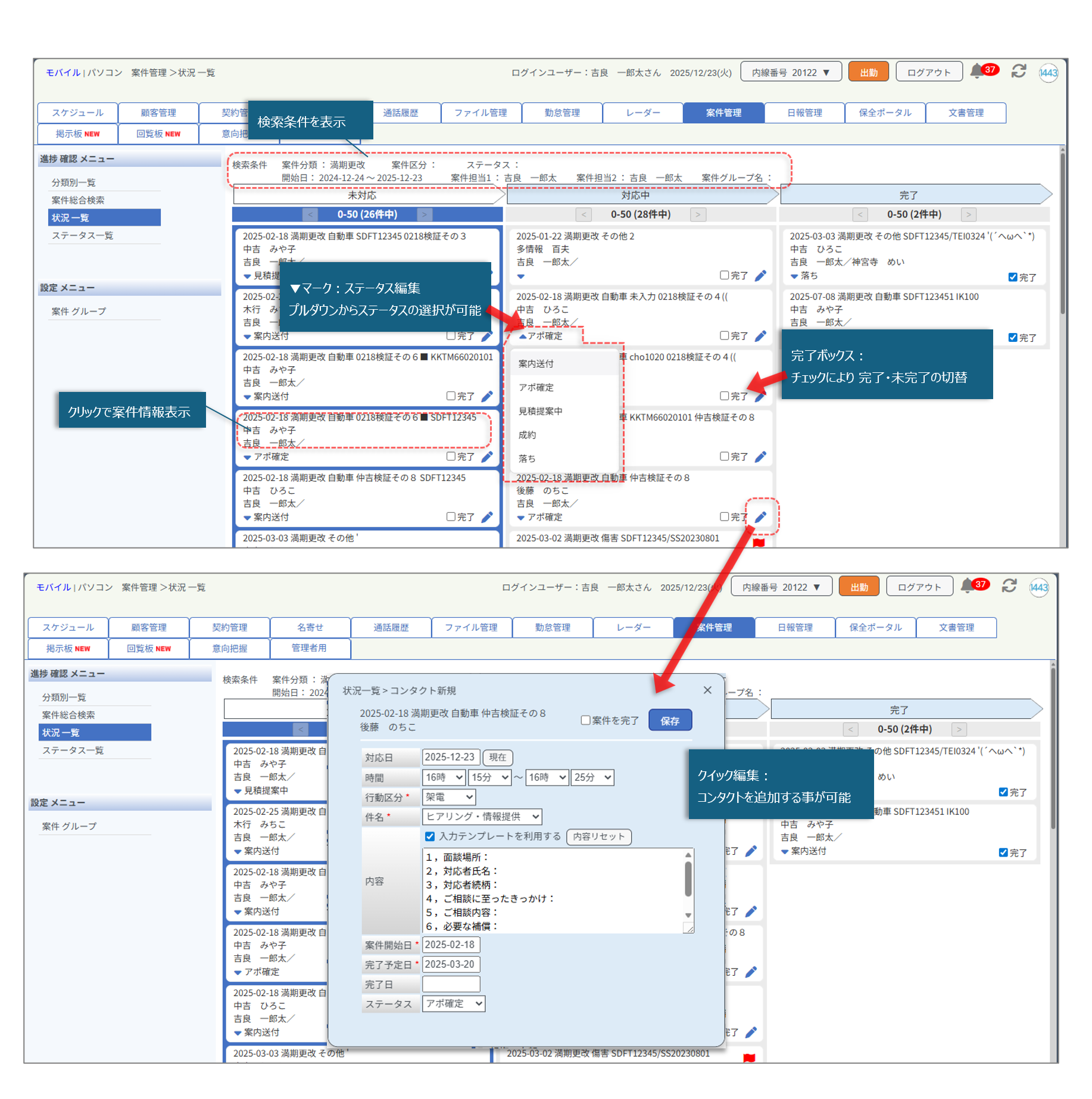 加えて、各案件情報上から簡単にステータス変更・コンタクト追加・完了を実行する事ができます。