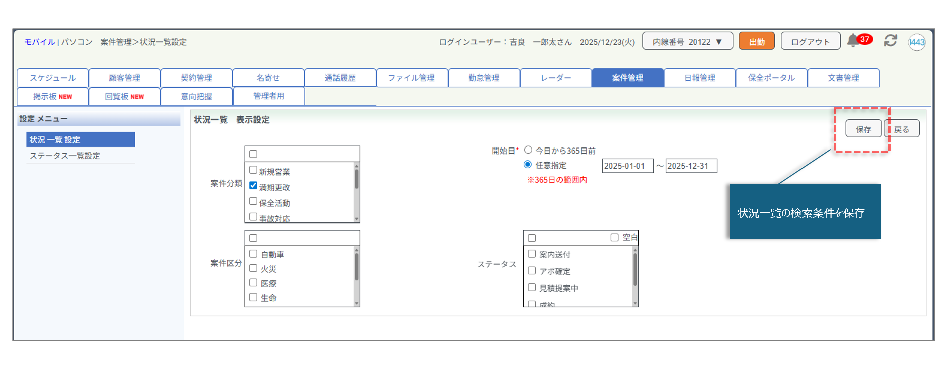 ■上部検索指示の条件を設定画面で保存しておくことが可能です。(各ユーザー毎)