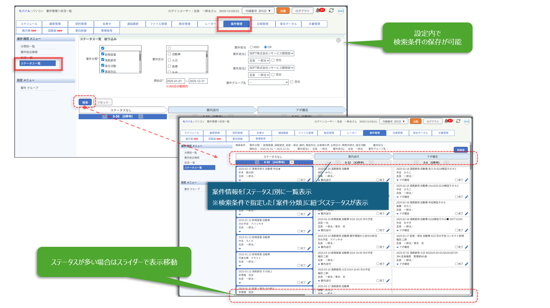 案件情報において、各案件分類へ紐づくステータス別で一覧表示する機能を追加しました。
