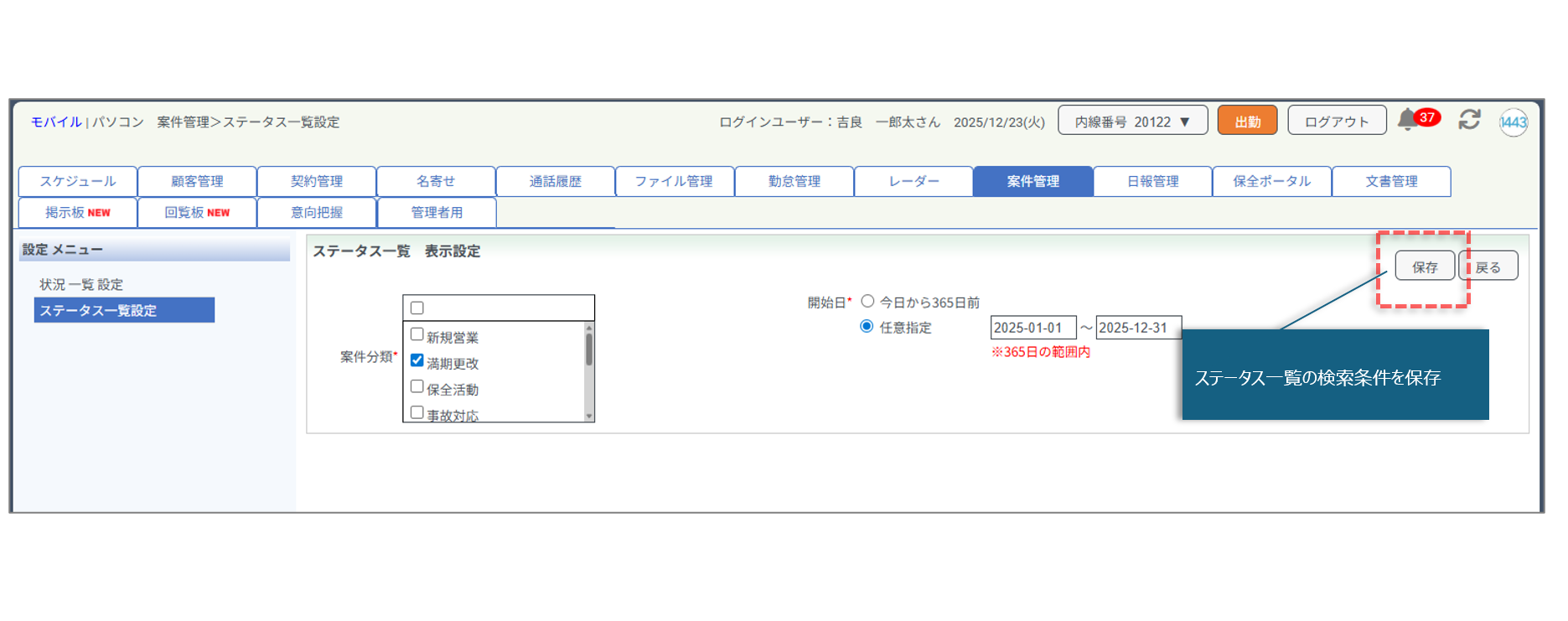 ・案件情報詳細を表示し編集時にステータスを変更保存した場合、一覧画面におけるステータス位置が変更されない為「再検索」を実行する事で正しい位置へ再表示されます。