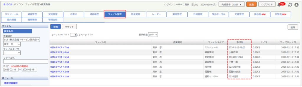 ファイル管理における表示項目に「添付先」を追加し、検索表示したファイルの添付先を表示するように改良いたしました。